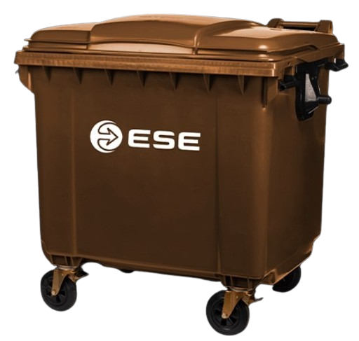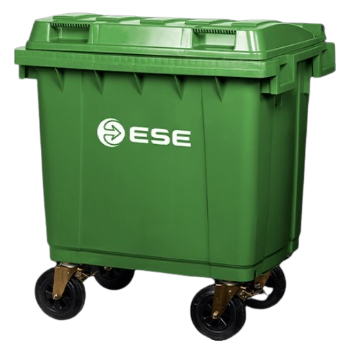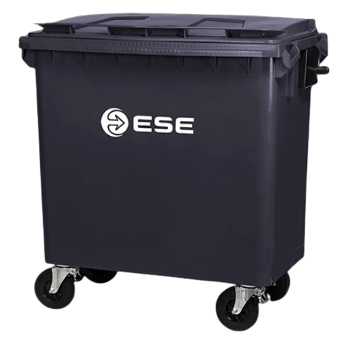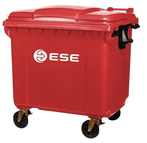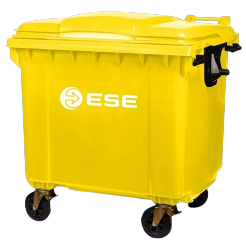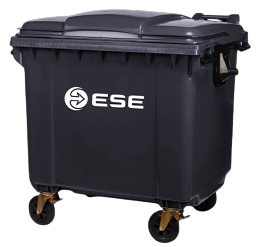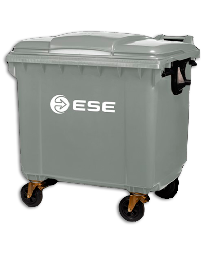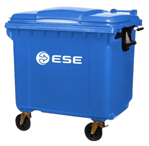 Contenedor de 1100L resistente fabricado con polietileno de alta de alta densidad, con protección UV y ruedas para manejarlo fácilmente.